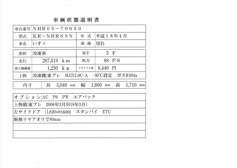 | コメント | AC PS PW エアバック 冷凍機:東プレ MJ21LSC-A -30℃設定 ガスR404a 上物箱:東プレ 2006年3月(H18年3月) 左サイドドア (L820×H1600) スタンバイ ETC 断熱リヤアオリで80mm 保障なし 価格のお問い合わせは、090-3156-0406(名輸自動車・ナカヤ)まで。 |