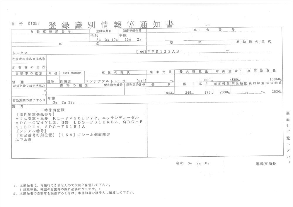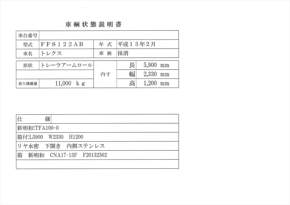 | コメント | アームロール用フルトレーラ 台車トレクス FFS122AB 上物 新明和TFA100-0 積載11.0t ステンレス箱 新明和CNA17-13F フルトレーラ用 落下防止 挿し込みピンロック一般の箱(22t車)にも使えます 箱内寸法:L5900 W2300 H1200 リヤ煽り水密 下開き ステンレスボディ 価格のお問い合わせ052-821-1557名輸自動車 中谷(ナカヤ)までお電話お待ちしてます。 |