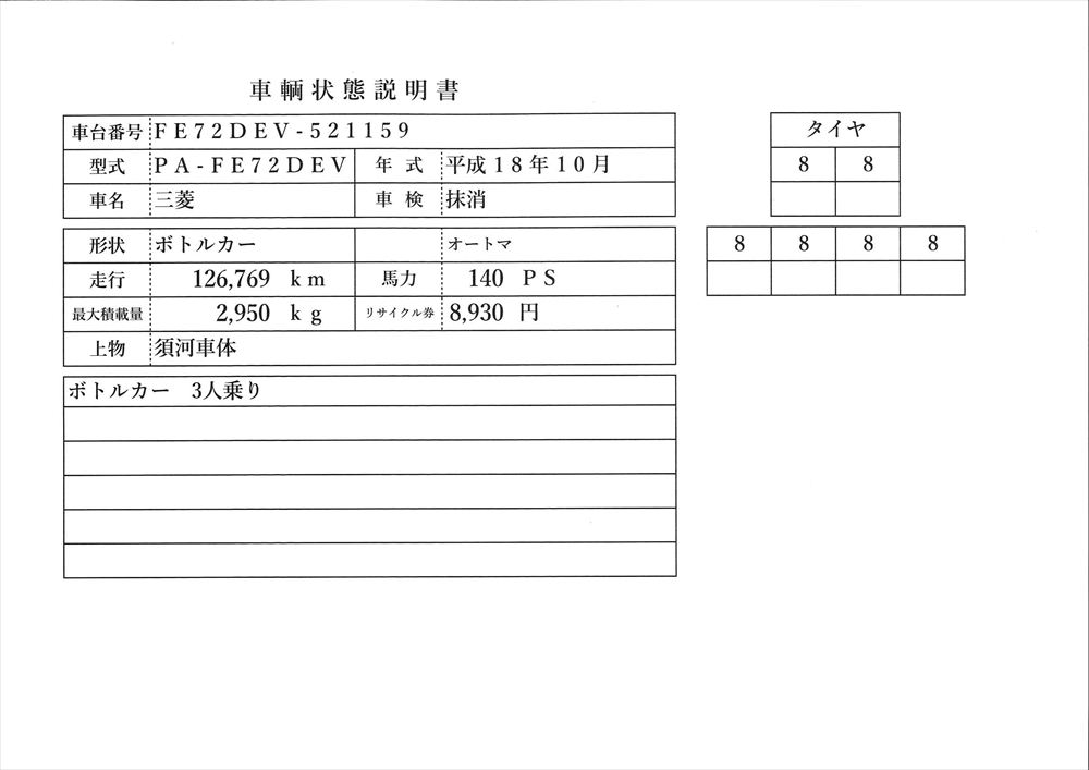 | コメント | 型式 PA-FE72DEV 車台番号 FE72DEV-521159 ボトルカー 積載2.95t AT 走行12万㎞ 須河車体 価格のお問い合わせ052-821-1557名輸自動車 中谷(ナカヤ)までお電話お待ちしてます。 |