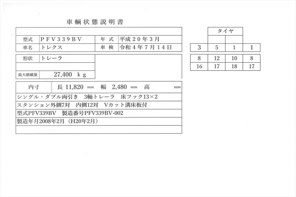 | コメント | トレクス PFV339BV 平成20年式(2008年2月) 3軸フラット トレーラ 車検令和4年7月14日 全長12m3 巾2m49 高250 シングル 引 前ピン 73㎝ 1m19(ピンから地面) フラット Vカット兼用 床板付 積載27,400㎏ 第五輪荷重11,340㎏以上 スタンション床フック 2デフでも引けます車検証記載 価格のお問い合わせ052-821-1557名輸自動車 中谷(ナカヤ)までお電話お待ちしてます。 |