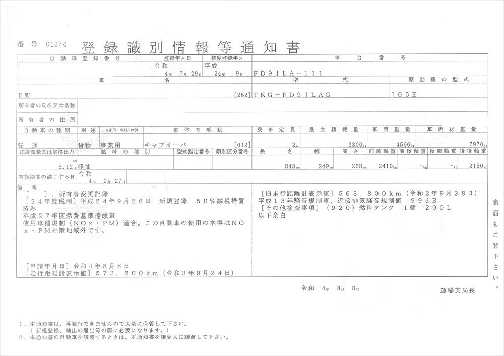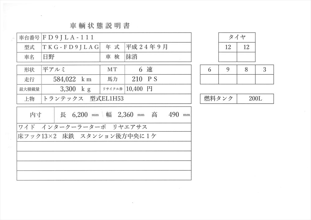 | コメント | ワイドボデー ロング 長6.2m ワイド巾広2.36 高49 平アルミ1枚煽り セーコーラック付 積載3.3t エアサス トランテックス 床フック13×2 床鉄板 スタンション後方中央に1ケ 日野4t 平成24年式 ベット付 210Ps 6速ミッション TKG-FD9JLAG 車検 抹消 価格のお問い合わせ052-821-1557名輸自動車 中谷(ナカヤ)までお電話お待ちしてます。 |
