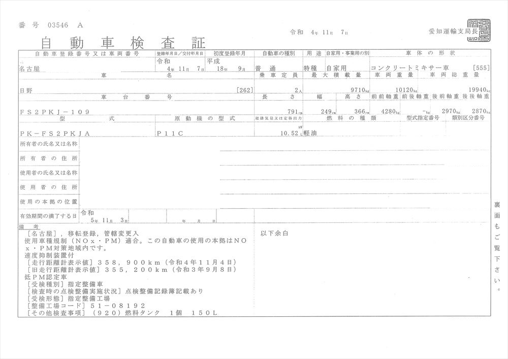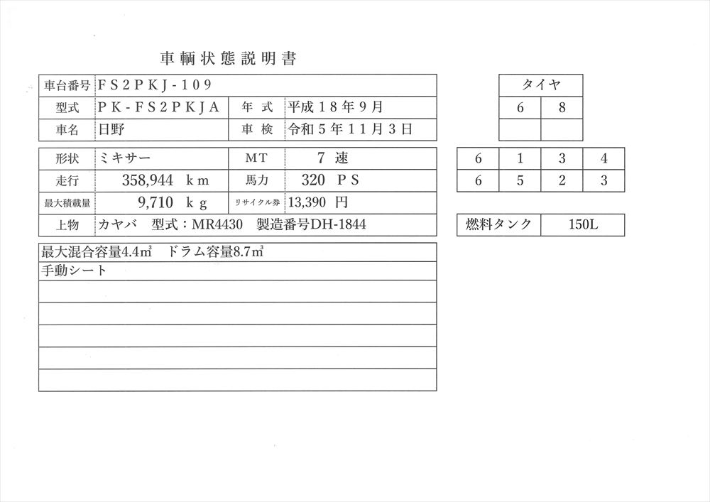 | コメント | 日野 平成18年式 PK-FS2PKJA 車検付 令和5年11月 320Ps 7速ミッション 2デフ カヤバ:型式MR4430 製造番号DH-1844 タンク回転 レバー式 最大混合容量4.4㎥ ドラム容量8.7㎥ 手動シート 汚水タンク 回転式 価格のお問い合わせ052-821-1557名輸自動車 中谷(ナカヤ)までお電話お待ちしてます。 |