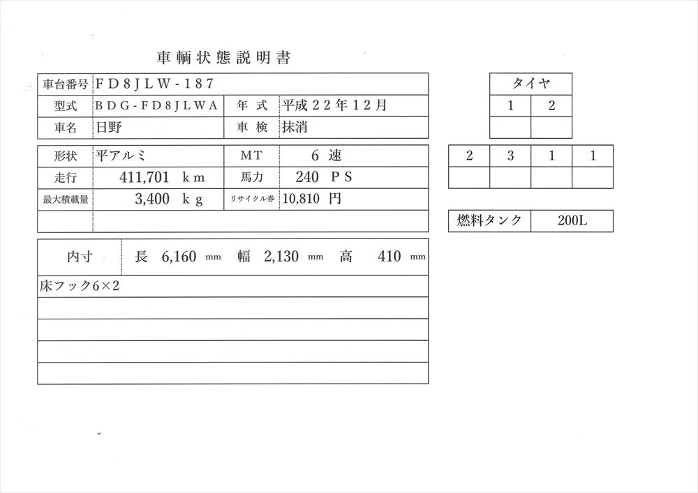 | コメント | 日野4t 平ボデー FD8JLWA 平成22年式 積載3.4t 平アルミ煽り 長6m16 巾2m13 高41㎝ 走行41万㎞ 床フック6×2 240Ps 6速ミッション 価格のお問い合わせ052-821-1557名輸自動車 中谷(ナカヤ)までお電話お待ちしてます。 |