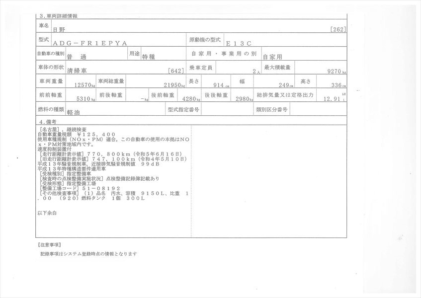 | コメント | 強力吸引車 ダンプ 排出 清掃車 兼松風量40 上物オールステンレス (タンク1周 リヤハッチ 前鏡 配管 キャッチャー全部) 型式:SM-13CVP スーパーモビール 動力57kw 風量40㎥/min 圧力-96KPa レシーバ10.0㎥ アンレット真空ポンプ 車検証 積載物 汚水 比重1.00容積9150L 前 積載物 油系 汚水の為 綺麗です 平成19年式 日野 車検付 令和6年6月 ADG-FR1EPYA 7速ミッション 360Ps 22t車 バックモニタ 燃料タンク300L 車両全長9.14m 巾2.49 高3.36 価格のお問い合わせ052-821-1557名輸自動車 中谷(ナカヤ)までお電話お待ちしてます。 |