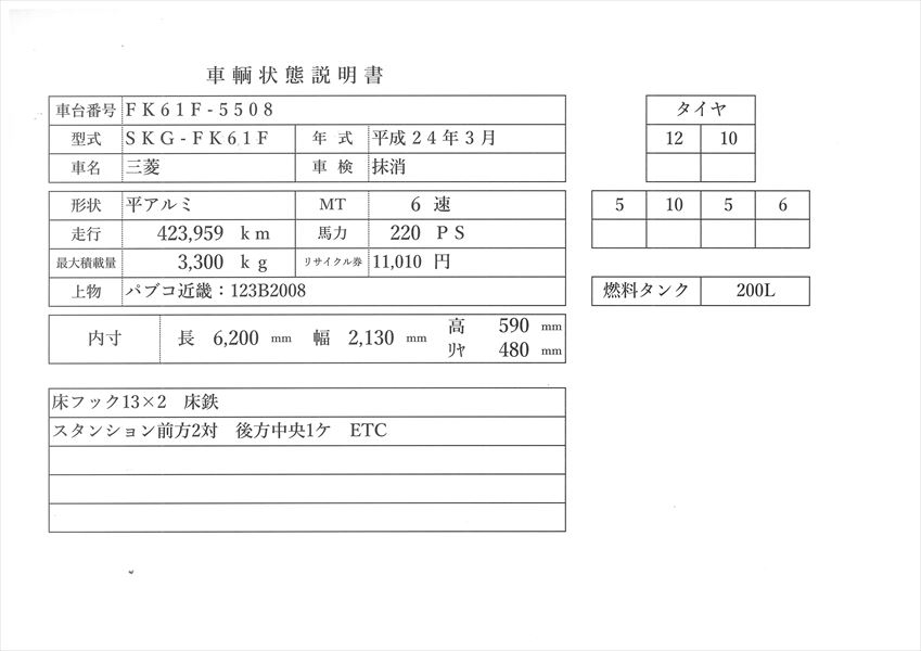 | コメント | 平成24年式 平アルミ 三菱ふそう SKG-FK61F 220Ps 6気筒ICターボ 積載3.3t ボデー長6.2m 巾2.1m 高59cm ベット付 パブコ:123B2008 床フック13×2 床 鉄板 スタンション前方2対 後方中央1ケ 価格のお問い合わせ052-821-1557名輸自動車 中谷(ナカヤ)までお電話お待ちしてます。 |