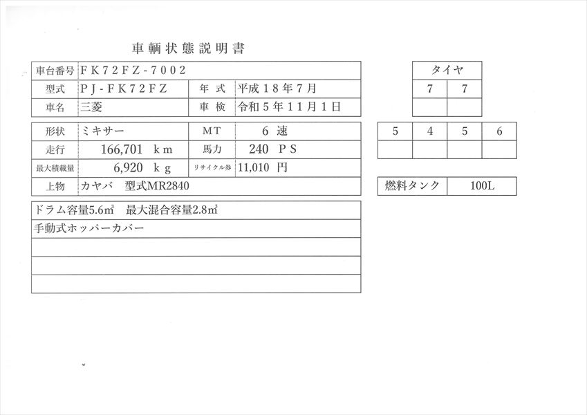 | コメント | カヤバ型式MR2840 ドラム容量5.6㎥ 最大混合容量2.8㎥ 手動ホッパーカバー 補助シュート付 三菱ふそう 走行16万㎞ 車検 令和5年11月 増t 積載6.92t 240Ps 6気筒インタークーラーターボ 6速ミッション 平成18年式 PJ-FK72FZ 無し マフラーすす焼き装置付いてません アドブルー装置 付いてません 価格のお問い合わせ052-821-1557名輸自動車 中谷(ナカヤ)までお電話お待ちしてます。 |