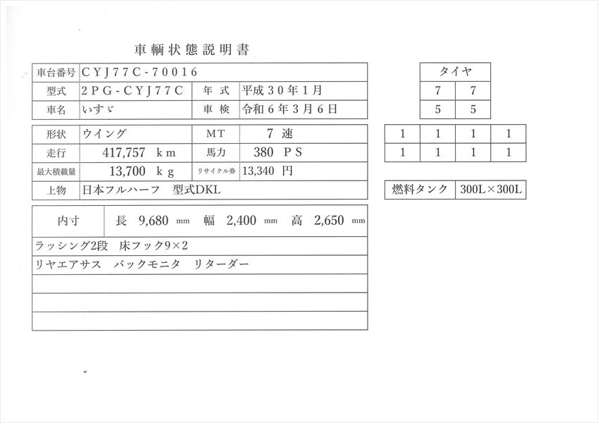 | コメント | いすゞ 2PG-CYJ77C アルミウイング 平成30年式 走行41万㎞ 積載13t700㎏ 4軸低床 リヤエアサス 380Ps インタークーラーターボ 7速ミッション 車検 令和6年3月6日 燃料タンク300L+300L リターダー バックモニタ 日本フルハーフ型式DKL ボデー長9m68 巾2m40 高2m65 ラッシング2段 床フック9×2 価格のお問い合わせ052-821-1557名輸自動車 中谷(ナカヤ)までお電話お待ちしてます。 |