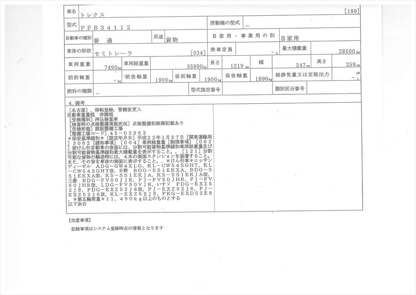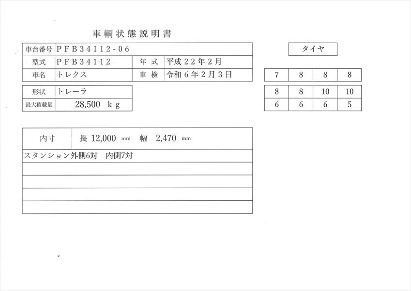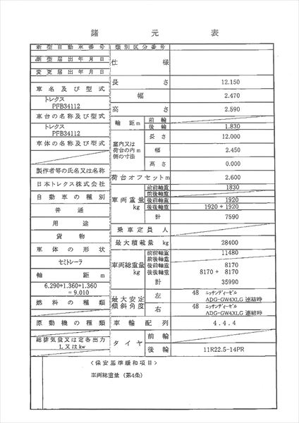 | コメント | トレクス 平成22年式 3軸フラット 第五輪荷重11,450㎏ 全長12.19m 荷台長12.0m 巾2.47m 積載28.5t 車両総重量35.99t 車両重量7.49t 車検6年2月 すぐ名義変更すぐ仕事できます シングル トラクタ引 Wトラクタ引 兼用 牽引車追加 当社可能 スタンション外側6対 内側7対 全部で26ヵ所 価格のお問い合わせ052-821-1557名輸自動車 中谷(ナカヤ)までお電話お待ちしてます。 |