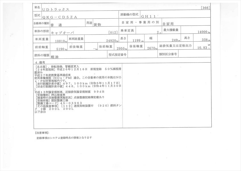 | コメント | 平成26年式 平アルミ 積載14.0t 車検6年12月 走行49万7000㎞ 3軸 地上高130㎝ボデー床から地面 7速ミッション 380Ps UD QKG-CD5ZA ボデー 長9.56m 巾2.34m 高60㎝ スタンション前方4ケ 後中央1ケ 床フック9×2 リヤエアサス リターダー 良好です エンジン ミッション デフ ボデー山田車体 煽り 3方開閉 5方開閉 兼用できます 価格のお問い合わせ052-821-1557名輸自動車 中谷(ナカヤ)までお電話お待ちしてます。 |