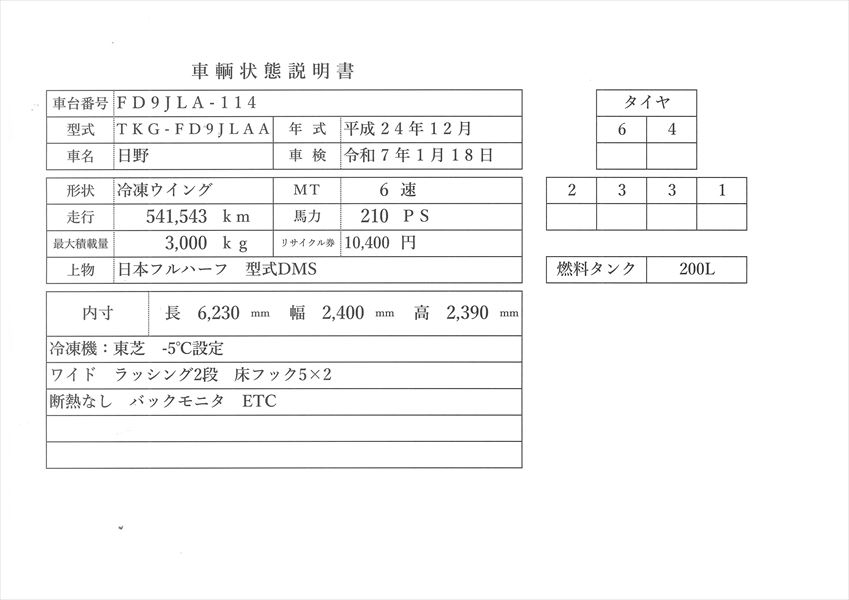 | コメント | 平成24年式 日野 冷凍ウイング 走行54万㎞ 積載3.0t 車検令和7年1月18日 ボデー内寸 L623 W240 H239 冷凍機:東芝 ラッシング2段 床フック5×2 バックモニタ TKG-FD9JLAA 価格のお問い合わせ052-821-1557名輸自動車 中谷(ナカヤ)までお電話お待ちしてます。 |