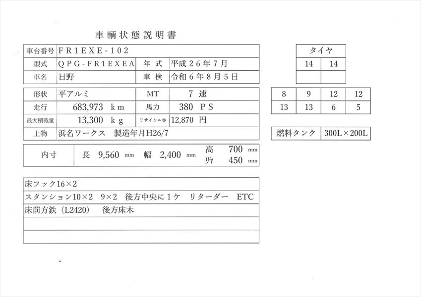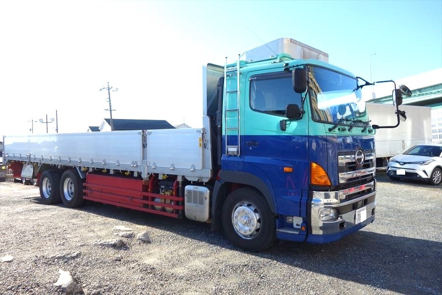 | コメント | 日野 平アルミ QPG-FR1EXEA 平成26年式 車検 6年8月5日 3軸 平ボデー アルミブロック 7速ミッション 380ps 走行68万㎞ ボデー内寸 長9.56m 巾2.4m 高70㎝ 床フック16×2 スタンション10×2 9×2 後方中央に1ケ リターダー 積載13t300 リーフサス 価格のお問い合わせ052-821-1557名輸自動車 中谷(ナカヤ)までお電話お待ちしてます。 |