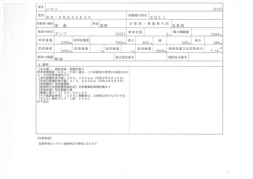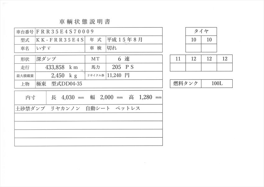 | コメント | 深長ダンプ ボデー長4m 巾2m 高1m28 10.3㎥ リヤ観音扉 自動シート 極東ボデー 型式DD04-35 イスズ KK-FRR35E4S マフラー焼き無し 車検6年8月 積載2.45t 6速ミッション 205ps 平成15年式 価格のお問い合わせ052-821-1557名輸自動車 中谷(ナカヤ)までお電話お待ちしてます。 |