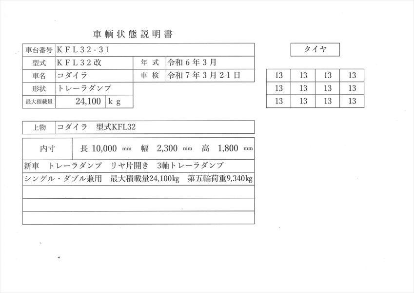 | コメント | 未使用車 令和6年式 車検 令和7年3月 3軸トレーラ 土砂禁ダンプ 積載24100㎏ 第五輪荷重9340㎏以上 車輛総重量35980㎏ 41.4㎥ 内寸10m 巾2.3m 高1.8m リヤ煽り片開き シングル引き ダブル引き コダイラ KFL32 車両総重量35,980㎏ リヤ扉 開閉電動ロック スエーデン鋼ボデー 価格のお問い合わせ052-821-1557名輸自動車 中谷(ナカヤ)までお電話お待ちしてます。 |