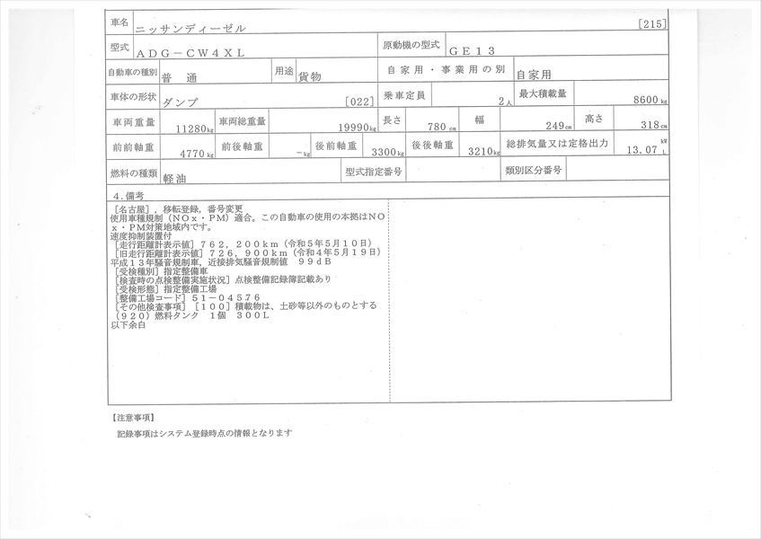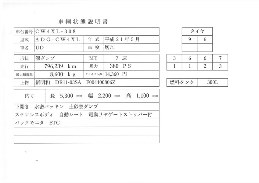| コメント | 土砂禁ダンプ UD 平成21年式 ステンレスボディ 新明和 DR11-03SA L5300 W2200 H1100 リヤゲート 水密パッキン 7速ミッション 2デフ 380ps ADG-CW4XL 自動シート 電動リヤゲートストッパー付 バックモニタ ETC 車検切れナンバー付 価格のお問い合わせ052-821-1557名輸自動車 中谷(ナカヤ)までお電話お待ちしてます。 |