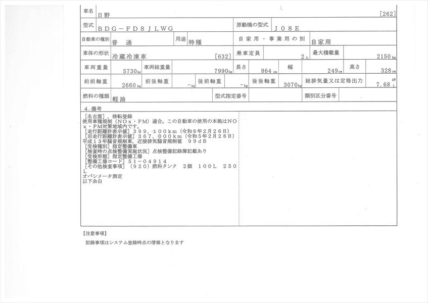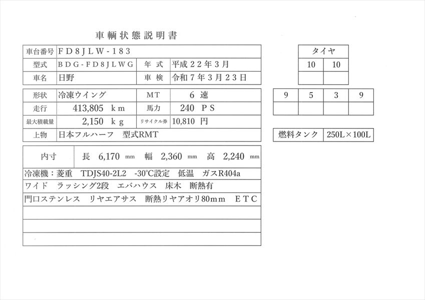 | コメント | 日野 BDG-FD8JLWG ワイド 冷凍ウイング 走行41万㎞ 菱重 TDJS40-2L2 車検 令和7年3月 ボデー内寸 L6.17m ワイド2.36m H2.24m 積載2t150㎏ 上物箱:日本フルハーフ ラッシング2段 エバハウス 床木 断熱有 6速ミッション 240ps 6気筒ターボ 門口ステンレス スタンバイ電源 エアスス 価格のお問い合わせ052-821-1557名輸自動車 中谷(ナカヤ)までお電話お待ちしてます。 |
