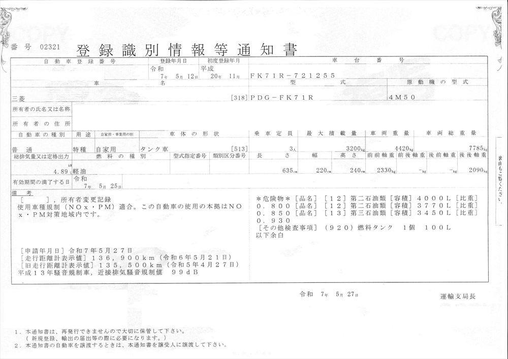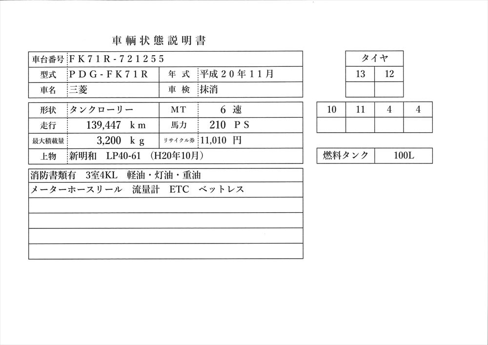 | コメント | 型式 PDG-FK71R 車台番号 Fk71R-721255 新明和 LP40-61 消防書類有 メーターホースリール 流量計 ETC ベットレス 3室 4KL 灯油 軽油 重油(重油は積んでません) 6速ミッション 210ps 価格のお問い合わせ052-821-1557名輸自動車中谷(ナカヤ)までお電話お待ちしてます。 |
