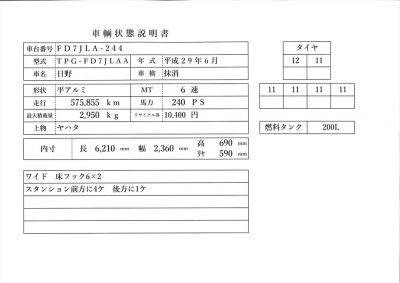 コメント | 日野 平アルミ 平成29年式 型式 TPG-FD7JLAA 車台番号 FD7JLA-24451 ボデー内寸 L6.2m ワイド2.36m H70 6速ミッション 240ps 上物箱:ヤハタ 床フック6×2 鳥居 床フック1 スタンション前方に4ケ 後方に1ケ 床きれいです 価格のお問い合わせ052-821-1557名輸自動車中谷(ナカヤ)までお電話お待ちしてます。 |