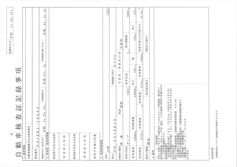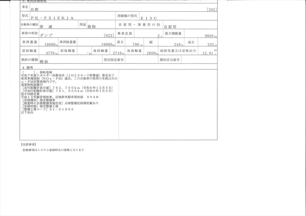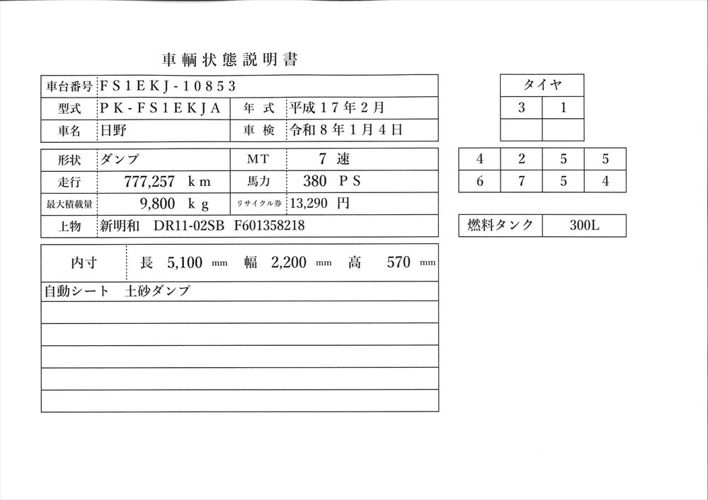 | コメント | 日野 2デフ 土砂用ダンプ 車台番号 FS1EKJ-10853 型式 PK-FS1EKJA 380ps 7速ミッション 積載9t800㎏ 走行77万㎞ 新明和 DR11-02SB ボデー内寸 L5100 W2200 H570 車検8年1月 自動シート 床 ヘルテン 1枚鋼 価格のお問い合わせ052-821-1557名輸自動車中谷(ナカヤ)までお電話お待ちしてます。 |