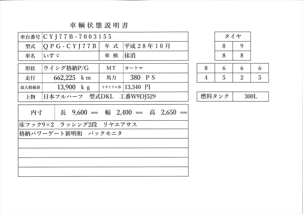 | コメント | 格納パワーゲート新明和 アルミウイング 4軸低床 いすゞ 平成28年式 車台番号 CYJ77B-7003155 型式 QPG-CYJ77B 380ps 積載13.9t 走行66万㎞ 床フック9×2 ラッシング2段 リヤエアサス バックモニタ 価格のお問い合わせ052-821-1557名輸自動車中谷(ナカヤ)までお電話お待ちしてます。 |